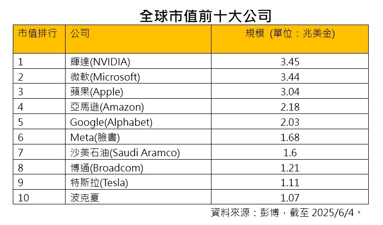 至於科技股的領頭羊:輝達(NVIDIA),近1個月股價持續往上;同屬科技巨擘的博通、資安王者CrowdStrike也隨勢大漲。目前全球市值前十大公司,尖牙股占據了半壁江山。