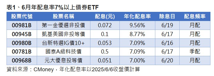 以債券ETF來看,6月的年配息率領先群,再度由月配息的非投等債ETF:第一金優選非投債(00981B)奪冠,年化配息率高達9.56%,00981B自5月首次配息以來,連續2個月維持配息金額0.072元。