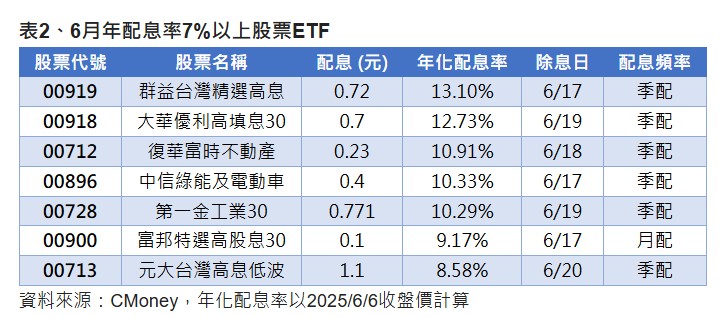 至於股票ETF,年化配息率冠亞軍分別是群益台灣精選高息(00919)、大華優利高填息30(00918),其次像是復華富時不動產(00712)、中信綠能及電動車(00896),及第一金工業30(00728)等,年化配息率也都超過10%。