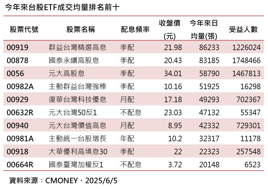 00919這次預估配息0.72元,連續9季的年化配息率都逾10%,吸引買盤進駐,統計今年以來,日均成交量8.6萬張,居台股ETF成交王,另外,00878國泰永續高股息、0056元大高股息、00982A主動群益台灣強棒,日均量也達5萬張以上。