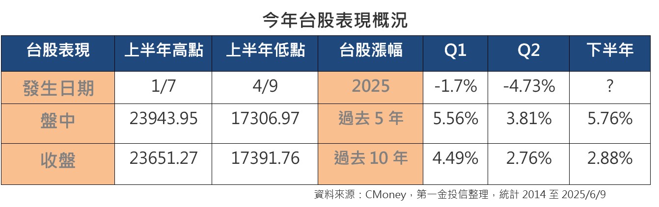 展望後市,第一金投信指出,美股已重回年初高點,但台股距離年初高點仍有近千點距離,台股可望逐步修復第一季、第二季跌幅,重新挑戰年初高點,依過去5年、10年的台股表現觀察,下半年台股仍有高達七至八成機率上揚,過去5年、10年的平均漲幅分別為5.76%及2.88%,若美國與各國關稅談判歧見小、順利過關,AI需求持續暢旺下,台股後市續漲空間可期。