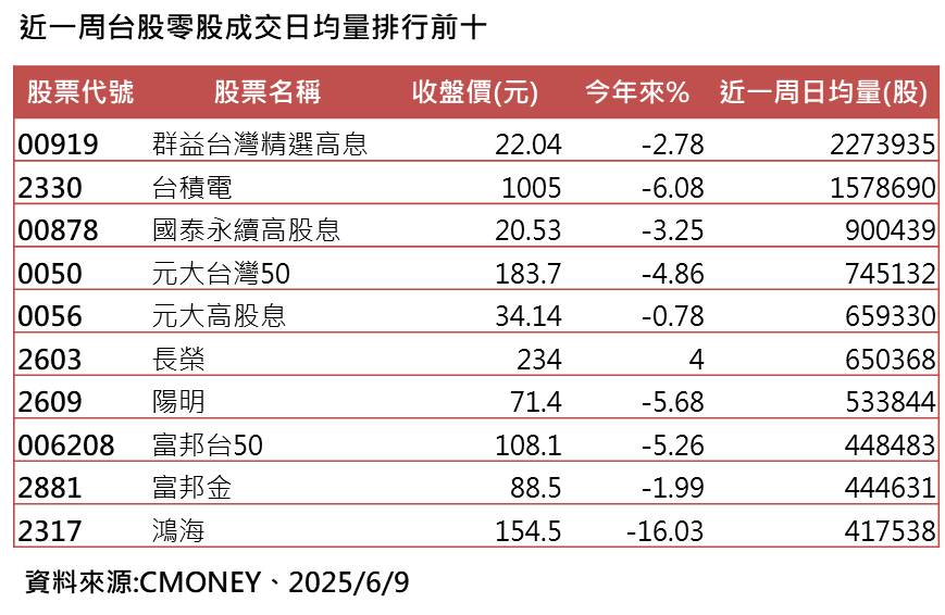 觀察近一周台股零股熱門交易前10大個股,台股ETF佔了5席,高股息ETF佔3席,顯示台股高息ETF持續受投資人青睞,其中,00919群益台灣精選高息ETF,日均成交量居冠;台積電排名第二,00878國泰永續高股息ETF排第三,0050台灣50排第四,都是散戶追逐的標的。