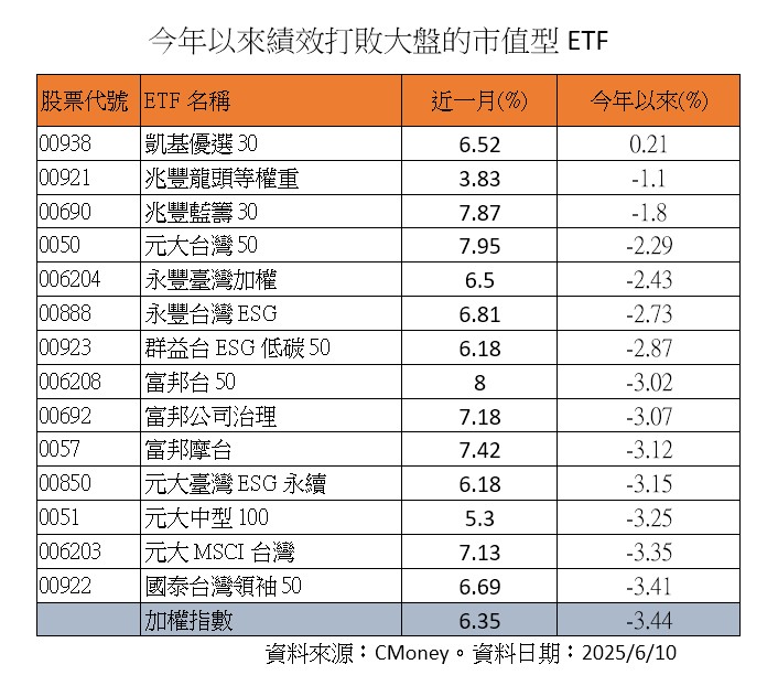 其中,凱基優選30(00938)拿下台股市值型ETF今年以來的績效王,是唯一正報酬,表現亮眼。