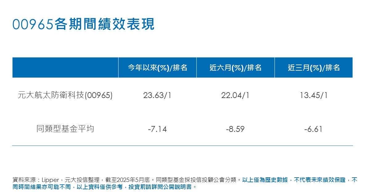 元大航太防衛科技(00965)ETF研究團隊指出,00965產品設計以歐美與亞太均衡配置,今年以來以歐洲與亞太防衛概念股領漲,彭博資訊統計至5月底,前三大成分股今年以來漲幅介於37.9%至152.3%,推升00965股價表現。
