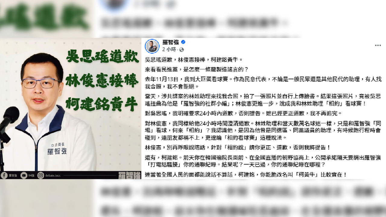 羅智強指出,去年11月13日他前往大巨蛋觀看球賽,期間有民眾與助理主動要求合照,當中包含涉共諜案的林姓助理,該合照由對方自行上傳臉書,未料此事竟被吳思瑤扭曲稱該助理為「羅智強的社群小編」,林俊憲更進一步稱雙方「相約看球賽」。