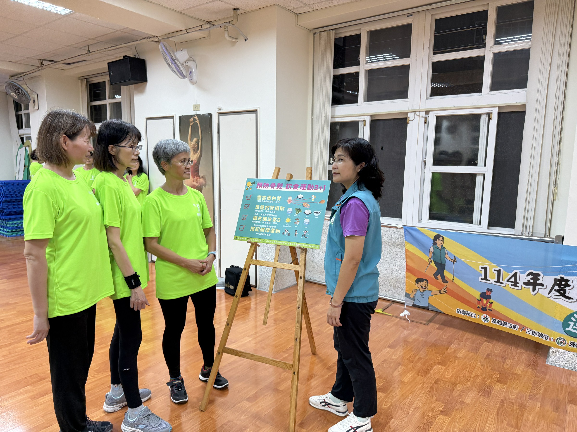 ↑圖說:趙紋華(穿藍色背心者)呼籲鄉親多攝取富含鈣質和維生素D的食材,以及優質蛋白質,再搭配規律運動強健骨骼、延緩肌肉流失。(圖片來源:嘉義縣衛生局提供)