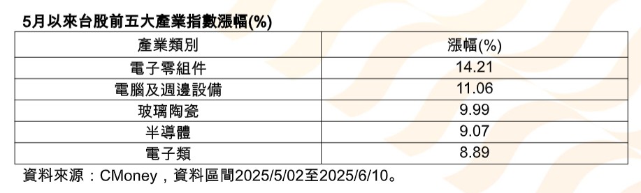 統一投信台股研究團隊指出,自5月以來推升台股走勢主要原因來自三大利多,包含關稅暫緩、AI需求穩健增溫,以及提前拉貨令企業財報亮眼等。根據CMoney統計自5/2至6/10,漲幅動能最顯著的前五大產業,依序為電子零組件、電腦及週邊設備、玻璃陶瓷、半導體及電子類;其中,電子零組件、電腦及週邊設備這兩類的漲幅均已超過兩位數。