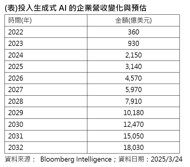 凱基雲端趨勢基金經理人馮紹榮表示,AI技術的快速落地,正在重塑全球商業模式,具備關鍵技術的公司將有機會在這波浪潮中脫穎而出。根據Bloomberg Intelligence資料顯示,生成式AI市場正以驚人的速度成長,2022年全球生成式AI營收僅360億美元,但2024年已躍增至2150億美元,3年間暴增5倍;今年營收預估達到3140億美元,未來4年營收將可能一舉突破1兆美元大關。