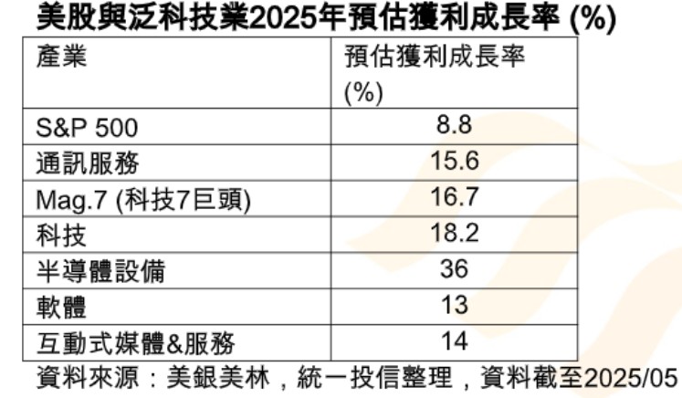郭智偉表示,雖然關稅政策對經濟及企業獲利造成壓力,但主要的下修皆已在4月反應,標普500指數的估值已修復至合理水平。整體而言,美股獲利仍由科技類股驅動;其中,半導體獲利成長率預估有望上看36%,其他相關產業預估獲利成長率則介於13%~18%之間,這些板塊均具備實現雙位數成長的潛力。
