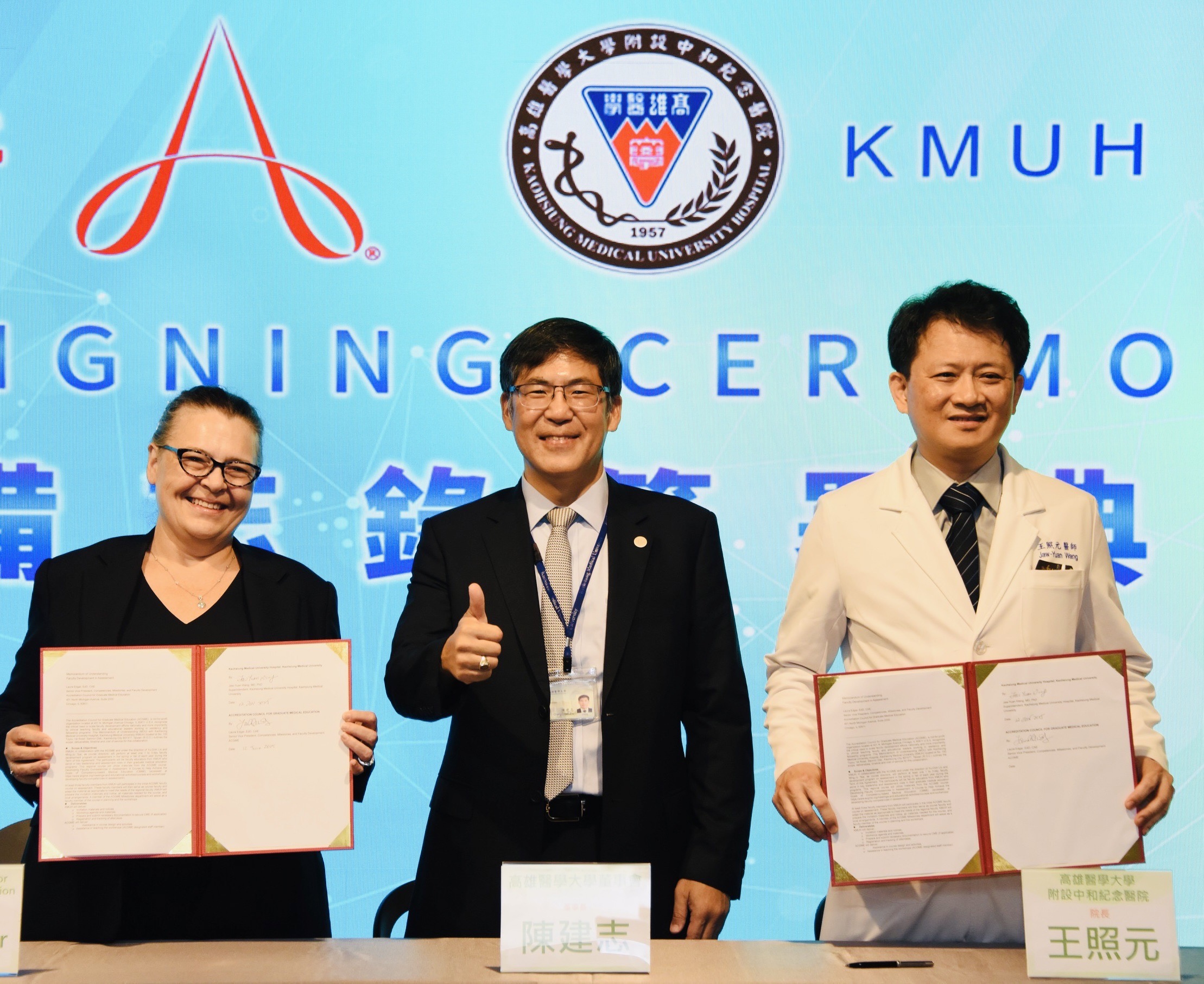 圖說:陳建志(中)見證王照元(右)與Laura Edgar代表簽署MOU。(圖片來源:高醫提供)