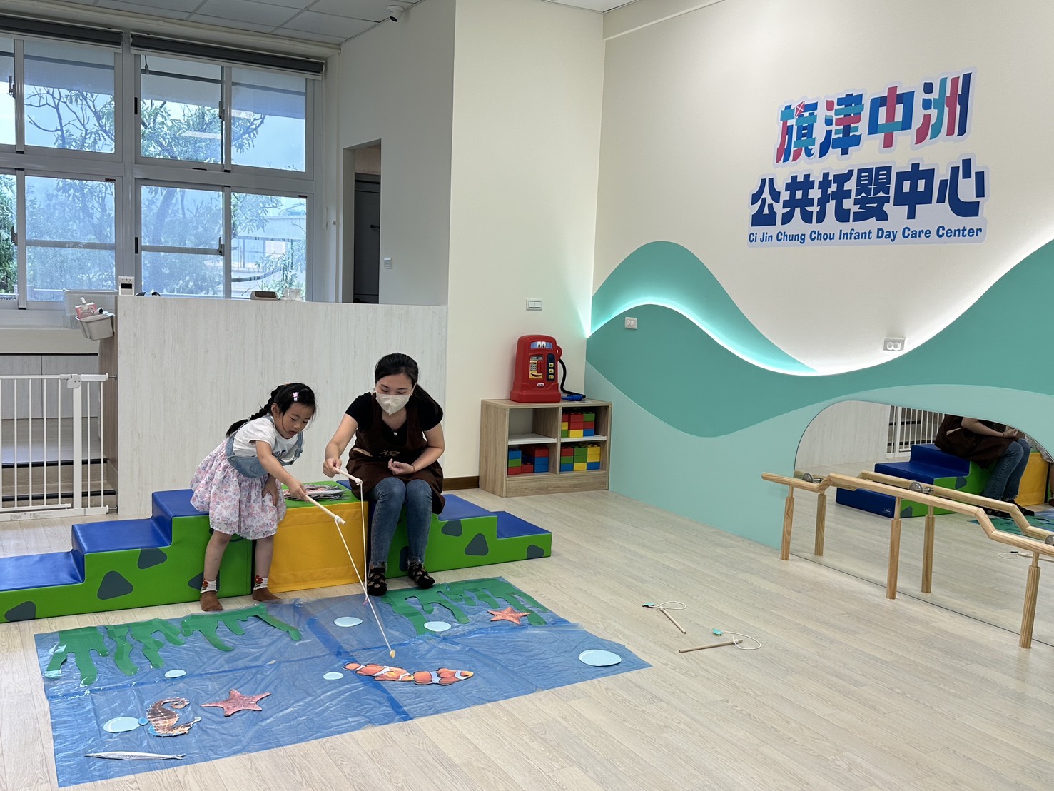 ↑圖說:托育人員與幼兒一起釣魚樂(圖片來源:高雄市社會局提供)