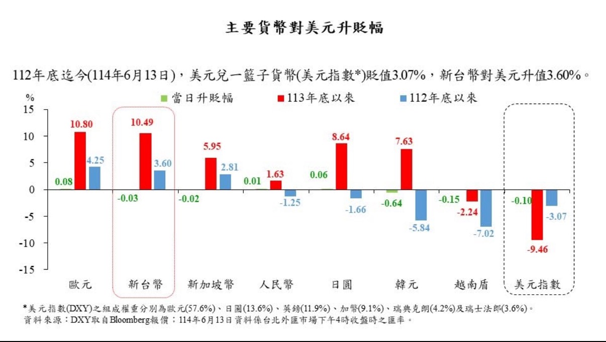 台幣部分,央行統計今年以來兌美元升值10.49%,低於歐元的10.8%升幅,但強過日圓的8.64%升幅,以及韓元的7.63%升幅。(如下圖,翻攝央行臉書粉絲專頁)