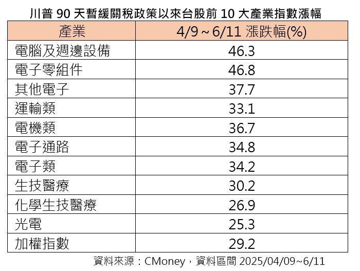 CMoney統計4/9~6/11的資料顯示,川普宣布暫緩90天關稅後,全球股市紛紛自低點回彈,台股也強勁回升。分析各產業分類指數表現,以電腦及電腦週邊設備、電子零組件的反彈最為顯著,這兩大產業指數漲幅超過45%,已回補了先前因關稅衝擊而造成的跌幅。