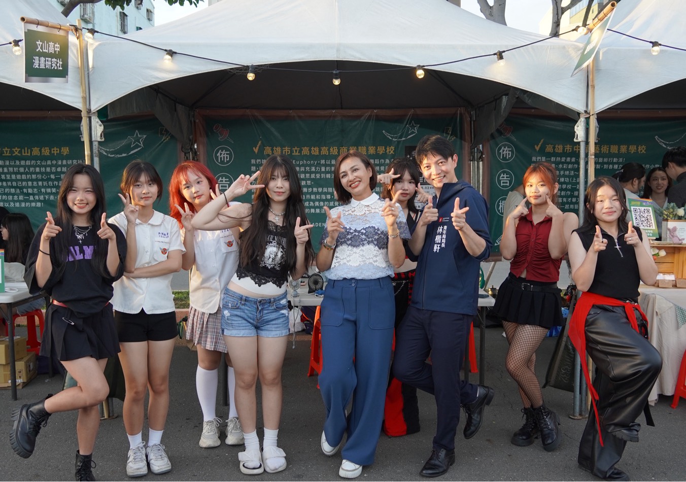 展攤部分同樣精彩,21組靜態攤位呈現動漫Cosplay、傳統工藝、攝影展、桌遊體驗等豐富內容,展現高雄學子驚人的創意能量。現場特設4.5公尺黑板牆邀請參與者寫下青春宣言,也提供專業攝影與即時沖洗相片服務,重現校園青春記憶,形成一處處打卡熱點。