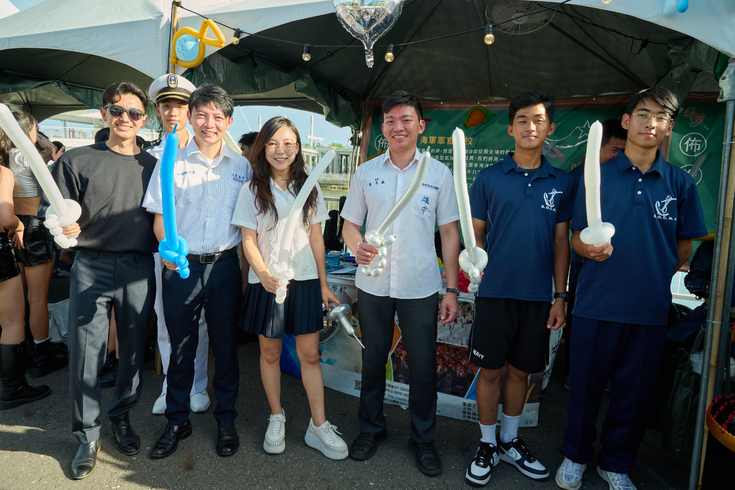 ↑圖說:青年局長林楷軒(左三)、教育局長(右三)吳立森及市議員白喬茵(左四)至海軍官校氣球造型社與學生互動,並體驗編折造型氣球的樂趣。(圖片來源:高雄市青年局提供)