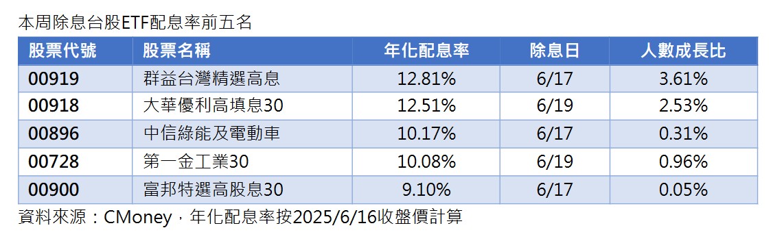 本周是ETF超級除息周,共有52檔股債ETF將進行除息,其中,台股ETF年化配息率前五高,均超過9%;債券ETF年化配息率前五高,也達7%以上,這10檔ETF持續吸引投資人加碼,投資人數皆見正成長。