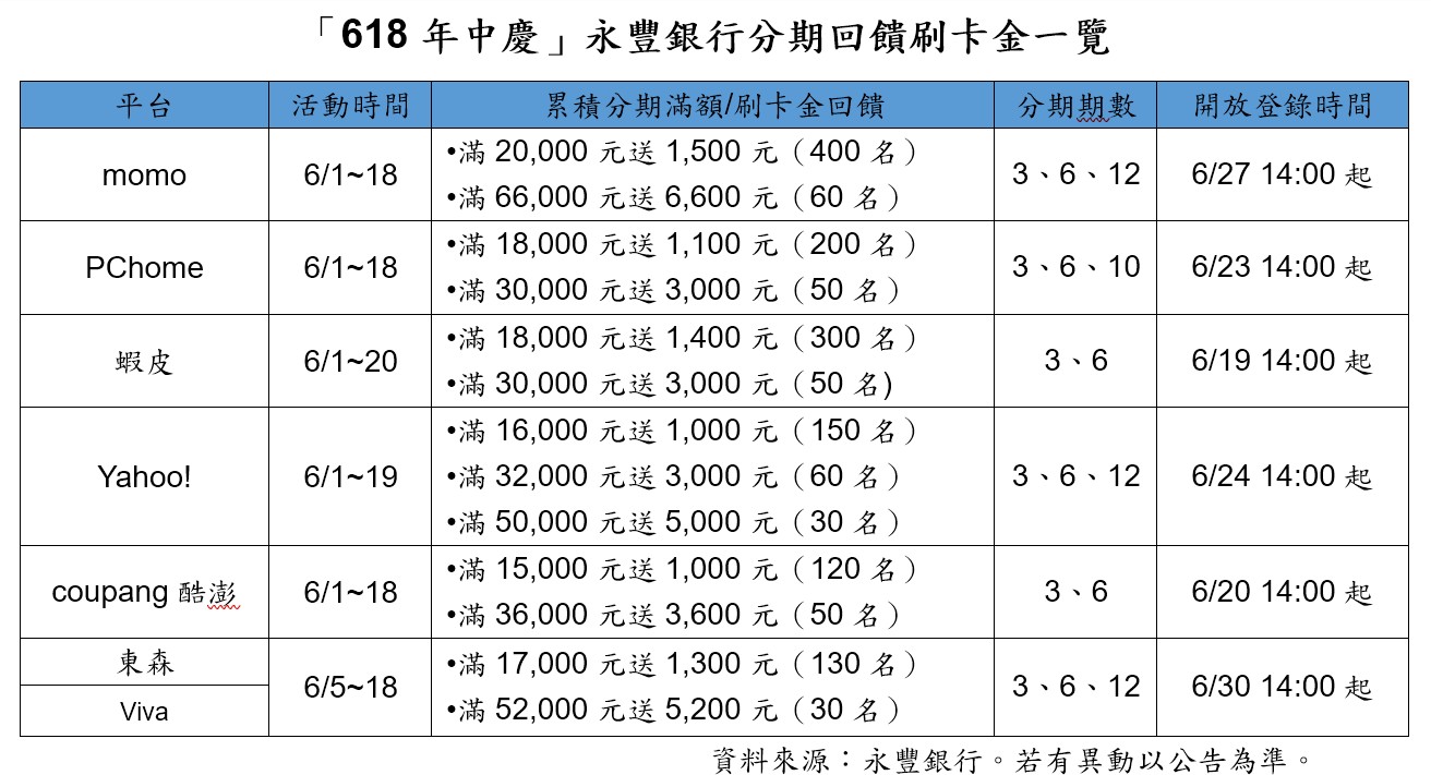 迎接電商購物節618年中慶,永豐銀行祭出總額超過300萬元刷卡金回饋,讓消費者一次購足所需物品並可分期付款以減輕負擔。即日起,於