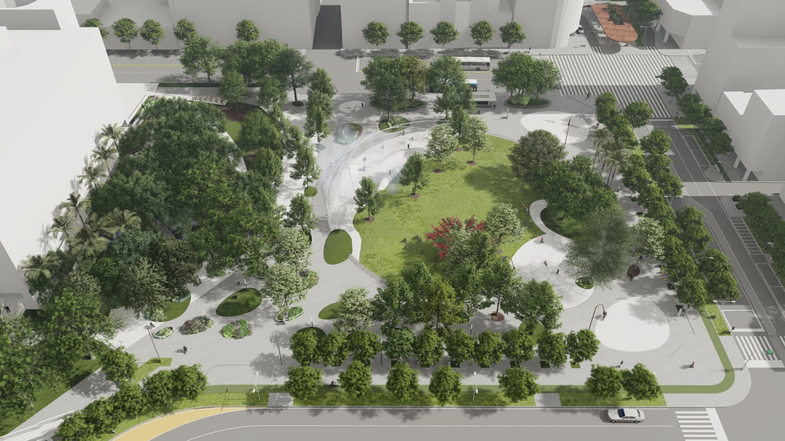 ↑圖說:鹽埕市民廣場占地近一公頃,位於中正四路、大勇路、大仁路三大幹道交會點,緊鄰鹽埕埔捷運站,是結合歷史紋理、生活機能與未來願景的重要節點。(圖片來源:模擬圖/高雄市工務局提供)