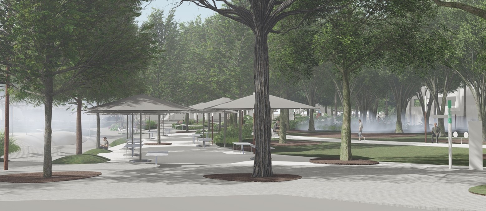 未來的市民廣場將以「城市大客廳」為概念,中間設置開闊草坪,可因應藝文展演、市集與社區活動需求。廣場特色設施「鹽埕酷環」,結合起伏地形與水霧系統,營造漣漪式動態水景,猶如飛濺水滴般點綴綠意帶狀空間。環繞步道空間則提供市民休憩與社交的開放平台。東側鄰近停車場處也將轉型為「都市小森林」,活化林下空間,營造更具層次的綠帶氛圍。
