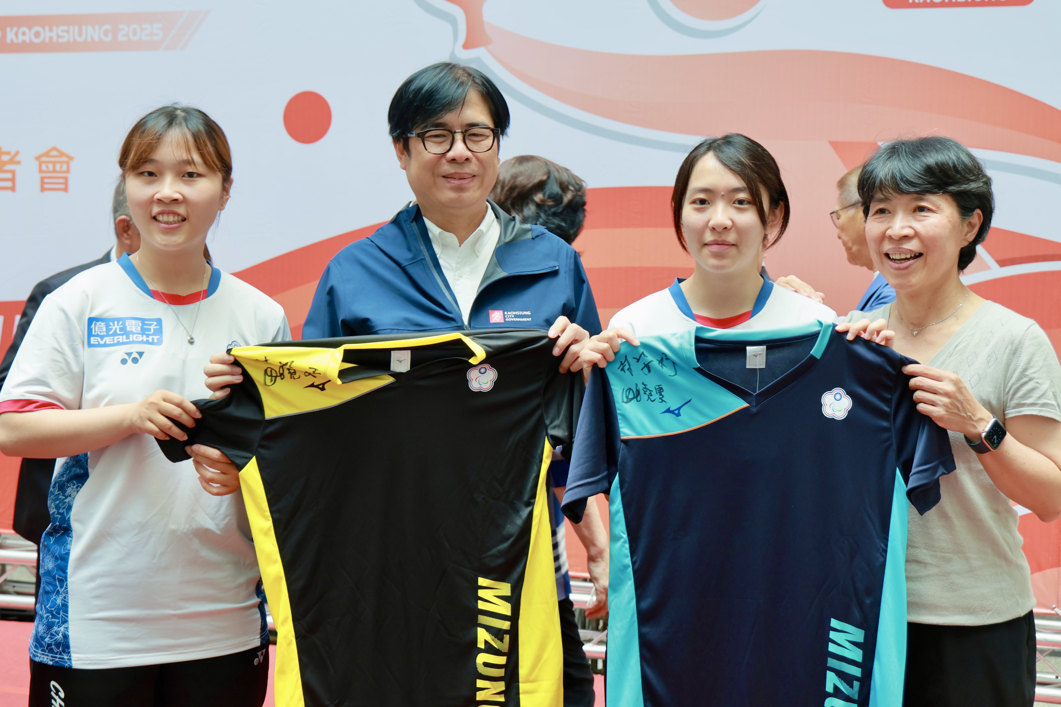 圖說:巴黎帕運高雄國手致贈陳其邁(左而)球衣。(圖片來源:高雄市政府提供)
