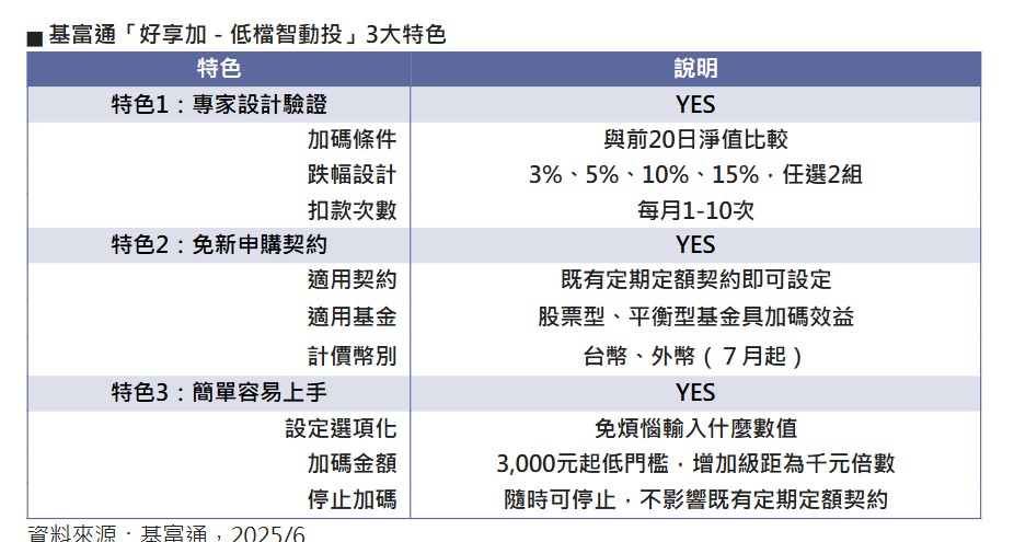 基富通表示,「低檔智動投」服務再升級,適用基金除原本的台幣申購,7月起將擴大至外幣計價級別的股票型與平衡型基金,也就是投資人可使用美元、歐元等外幣設定低檔自動加碼,加上平台的外幣帳戶線上核印服務,投資全球省事又便利。