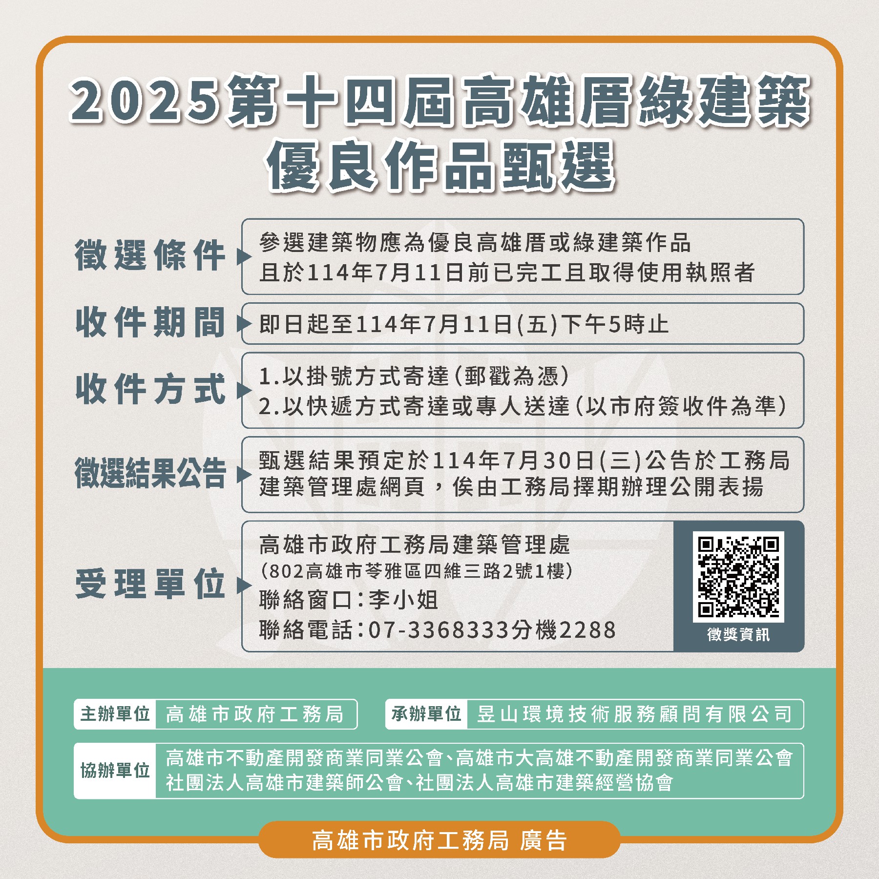 徵選相關報名資訊與詳細辦法,請參閱高雄市政府建築管理處官網(https://build.kcg.gov.tw)或電洽李小姐(07-3368333分機2288)。參賽資料請於截止日前寄送至高雄市苓雅區四維三路2號1樓工務局建築管理處,郵戳為憑或可親送報名。