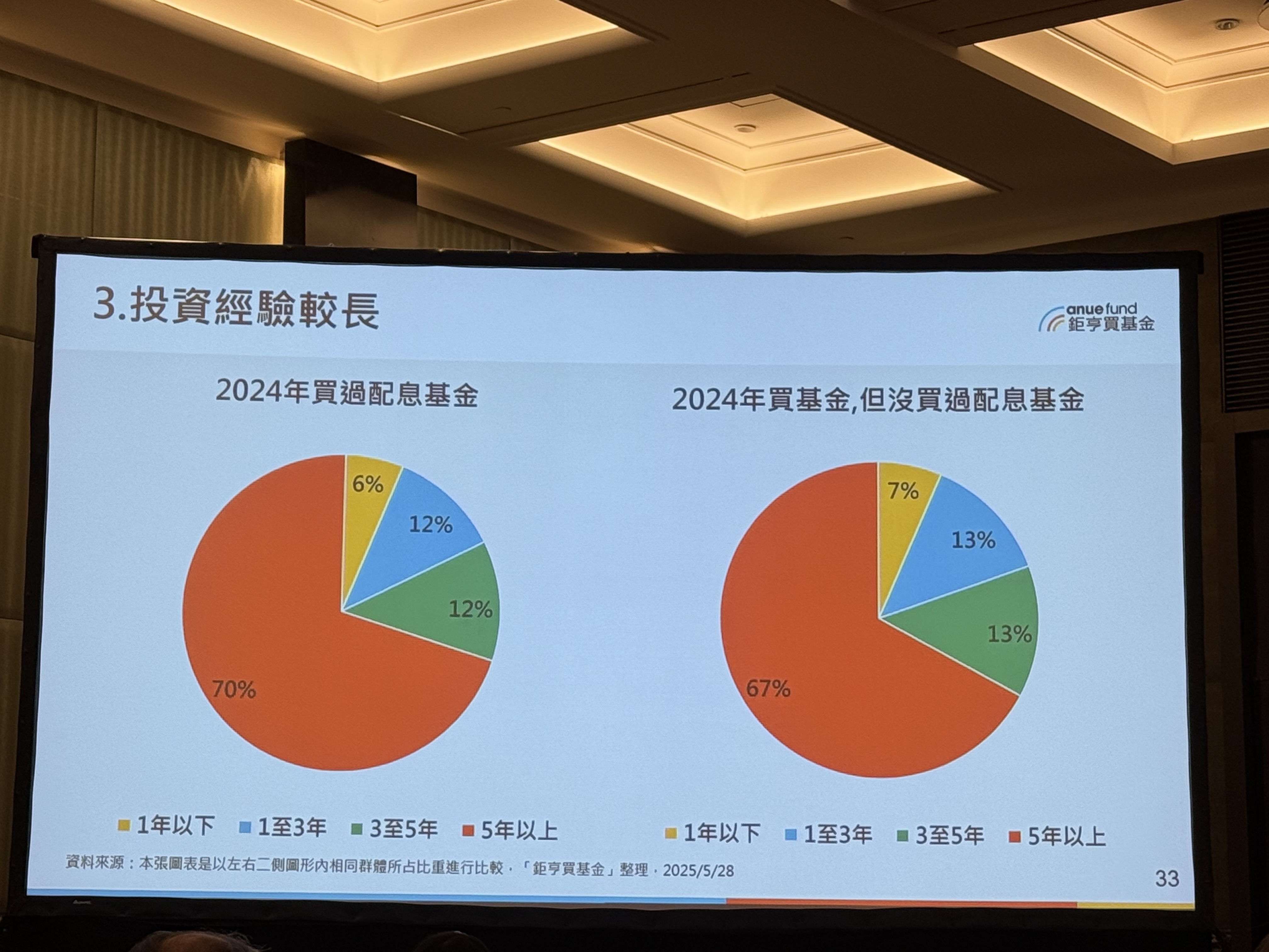 鉅亨買基金投資研究部主管羅瑤庭指出,投資經驗超過5年以上的人,2024年買過配息基金的比例高達70%;1年以下投資經驗的人,2024年買過配息基金的比例只有6%。(如下圖,記者李錦奇攝影)
