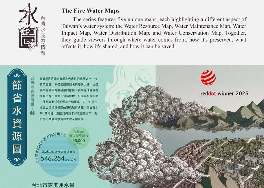 《水圖:以設計譜寫台灣水資源的視覺地誌》創作團隊為來自印尼的黃勻蔚、李雪英、朱曉結及來自香港的馬睿婷,是一項聚焦台灣水資源議題的教育設計專案,旨在以視覺化手法提升大眾對水資源永續管理的理解與重視,團隊透過手繪插圖與資訊設計技術,描繪出台灣豐富而多變的地貌與水文系統,形塑一幅兼具美感與知識性的「水資源情報地圖」。