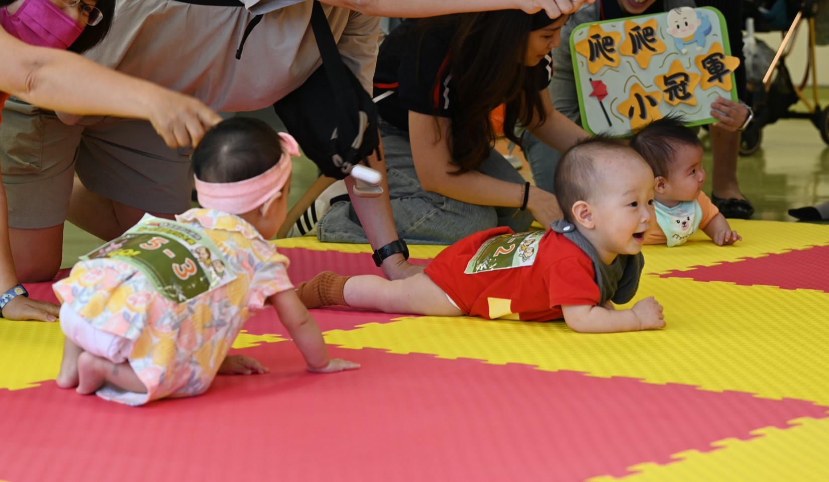 寶寶爬行活動現場設置專屬爬行賽道,比賽時,有的寶寶目標明確,朝著在終點等候的爸媽勇往直前努力衝刺,有的則在途中東張西望,找隔壁選手串門子,甚至原地打轉、哭著回頭找媽咪,現場笑聲不斷。為了鼓勵寶寶衝向終點線,家長們紛紛使出渾身解數,搖鈴鐺、揮舞玩偶、高喊寶寶名字,親子間的逗趣互動令人莞爾。