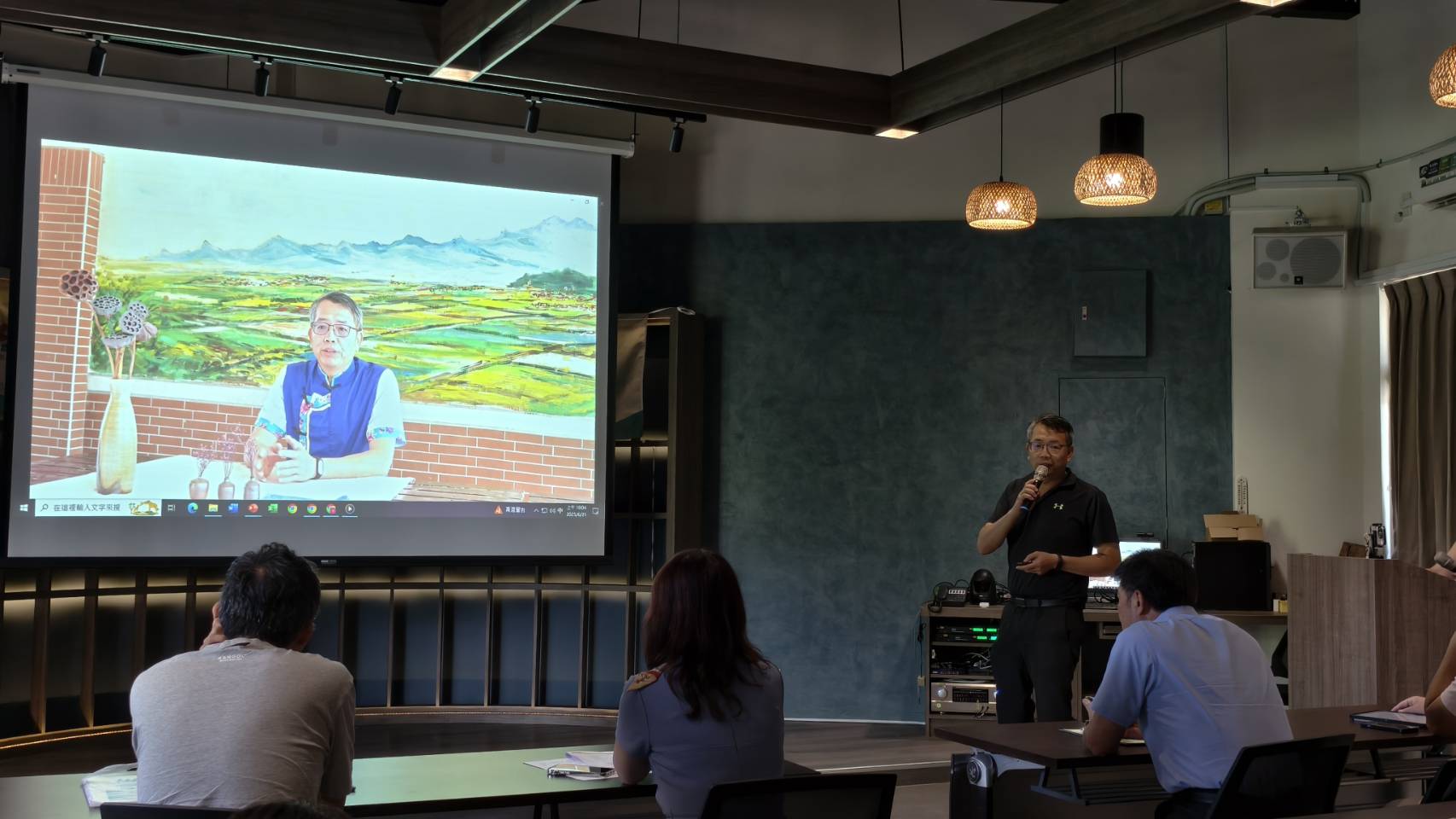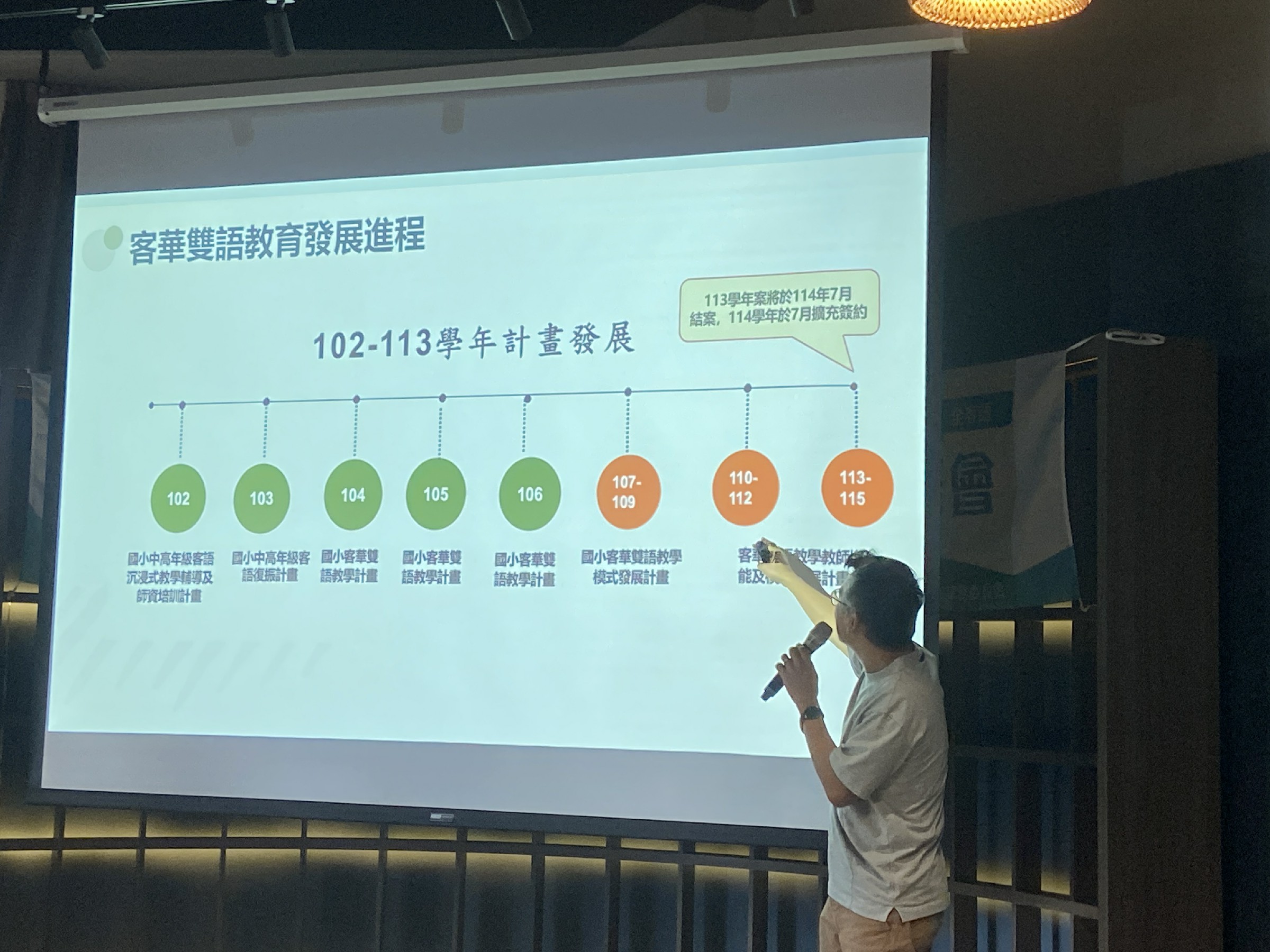 ↑圖說:南隆國中進行成果分享高師大鍾鎮城教授進行客華雙語教育成果報告(圖片來源:高雄市客委會提供)