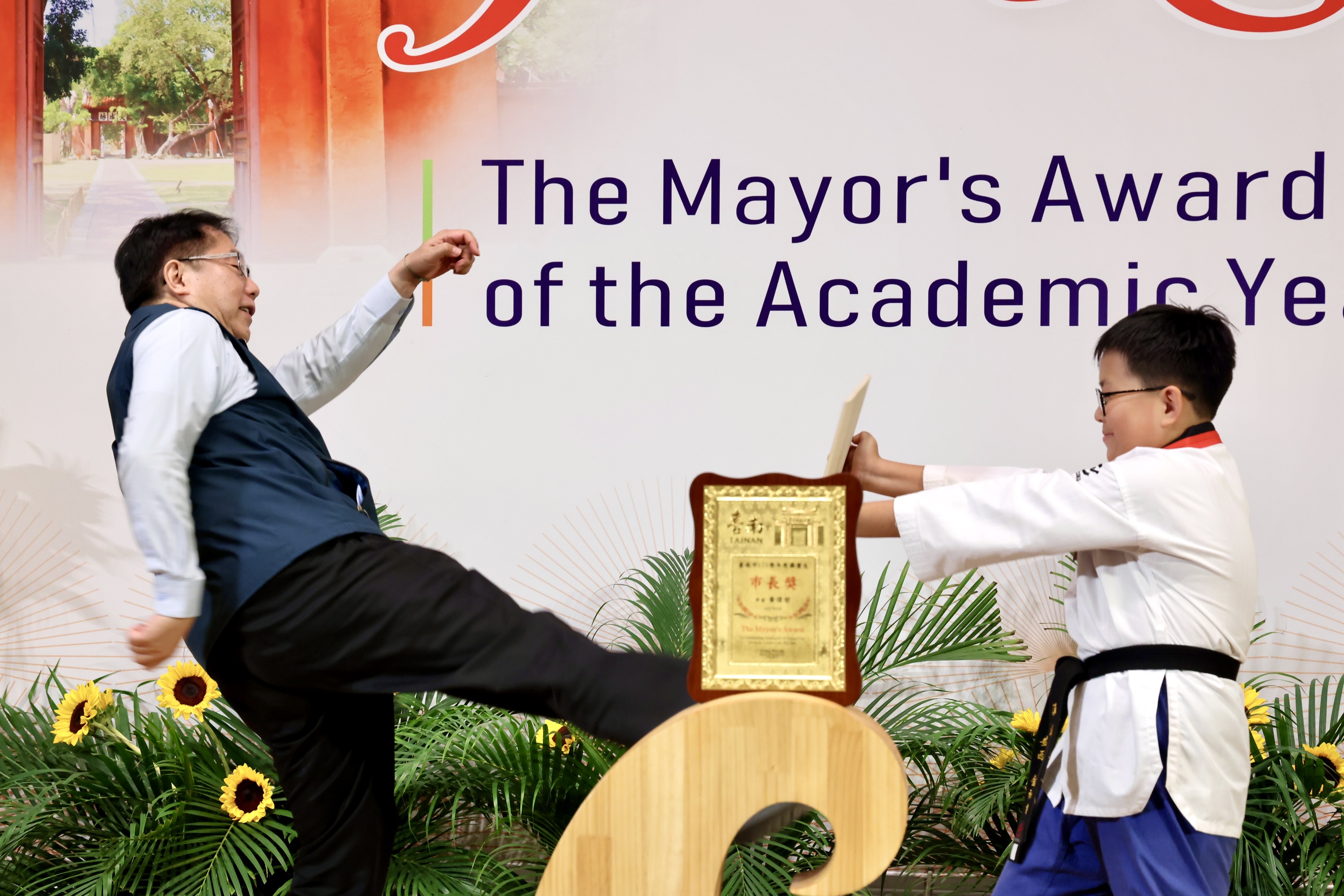 典禮氣氛熱烈,學生們創意十足,手持大頭佛頭套、魔杖等趣味道具與市長合影,還有學生即興拿出跆拳道木板,邀請市長踢破,掀起全場歡呼。雖然黃偉哲昨日在活動中不慎跌倒,今日依然誠意十足參與互動,還幽默自嘲:「明年會減肥一點,應該就背得動了!」