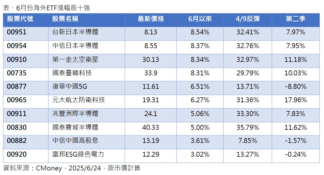 法人盤點海外ETF六月以來績效,半導體、太空衛星、中國等三大類表現最佳,其中,鎖定日本半導體的台新日本半導體(00951)、中信日本半導體(00954),及台灣唯一純太空ETF:第一金太空衛星(00910),及國泰臺韓科技(00735),6月以來股價漲幅皆逾8%,表現最為強勢。