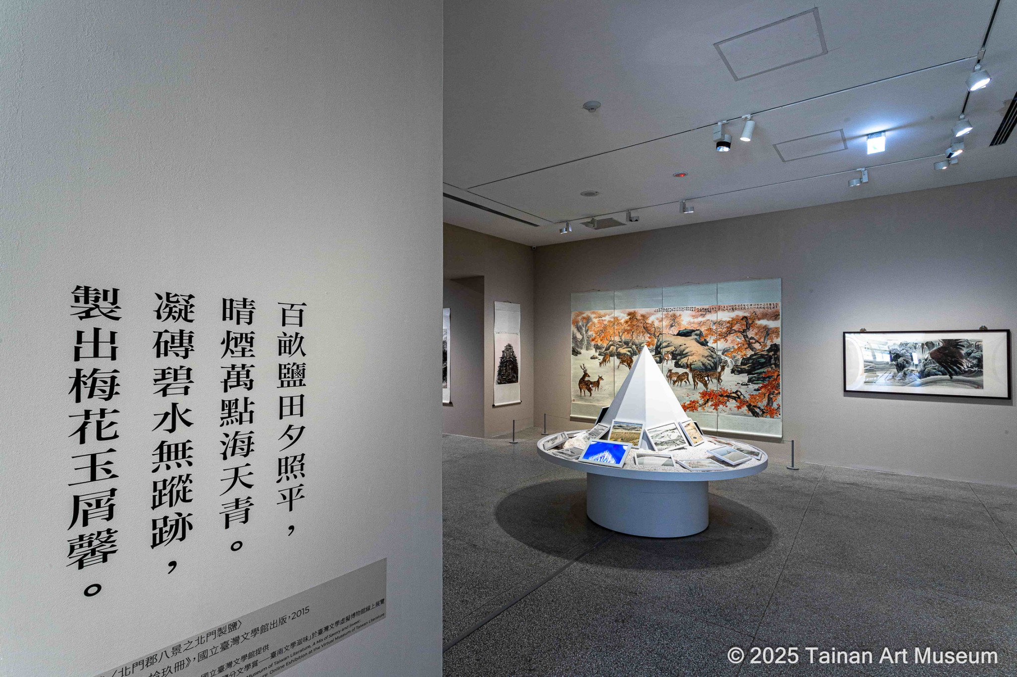 圖說:展場空間牆面詩句與展品相互呼應,呈現鹽分地帶文學與藝術交融的視覺場景(圖片來源/南美館提供)