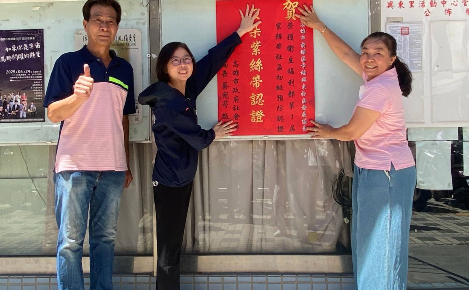 高雄市前鎮區幸福興東社區榮獲衛生福利部第1屆紫絲帶社區認證,獲頒2朵紫絲帶獎座與獎金,25日由社會局長蔡宛芬親自與社區理事長、幹部、志工一同張貼紫絲帶初級預防認證「紅榜」,共同見證社區在家庭暴力防治上的持續投入與創新實踐的榮耀。
