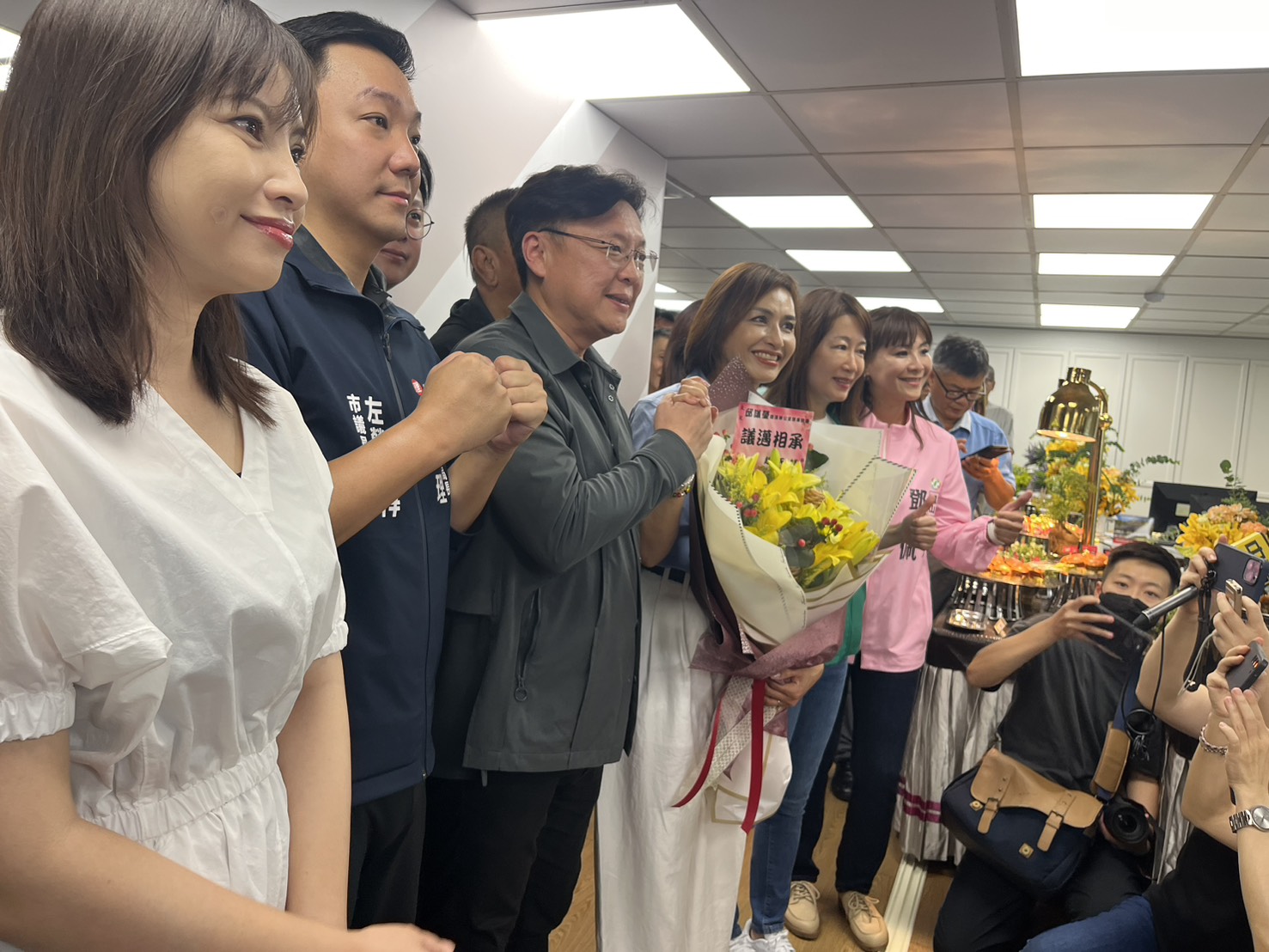 民進黨高雄市長初選參選人、立法委員邱議瑩25日成立競選辦公室,多位立委、議員、里長、後援會長與各行各業代表,透過親臨現場或拍影片表達祝賀,前市黨部主委許智善也代表弟弟立委許智傑到場,湧言會要角趙天麟更手捧「議邁相承」的花束喜現身,預祝邱議瑩順利當選下一屆高雄市長。
