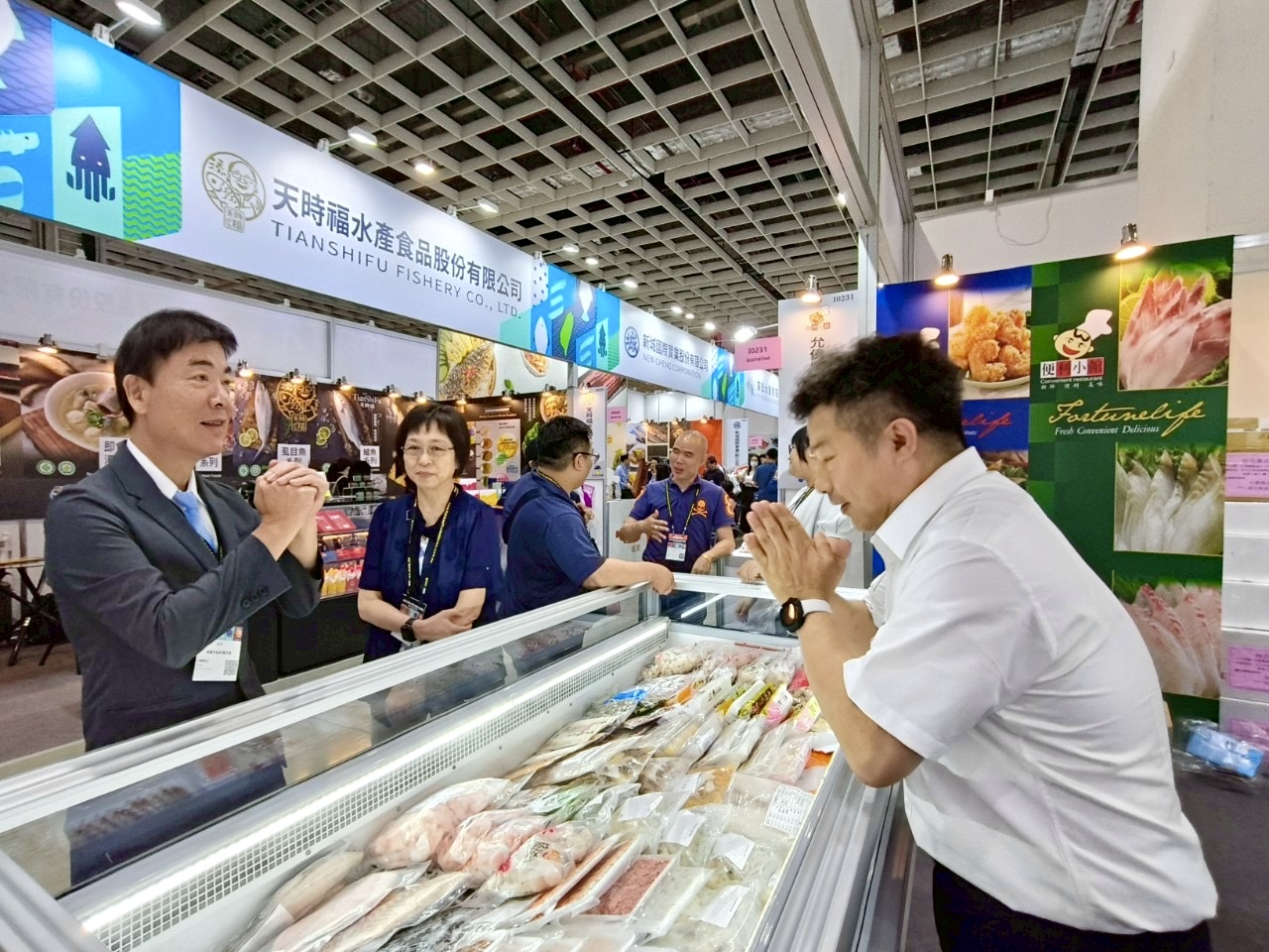 圖說:石慶豐(左一)台北食品展巡禮,並與高雄業者加油打氣。(圖片來源:高雄市海洋局提供)