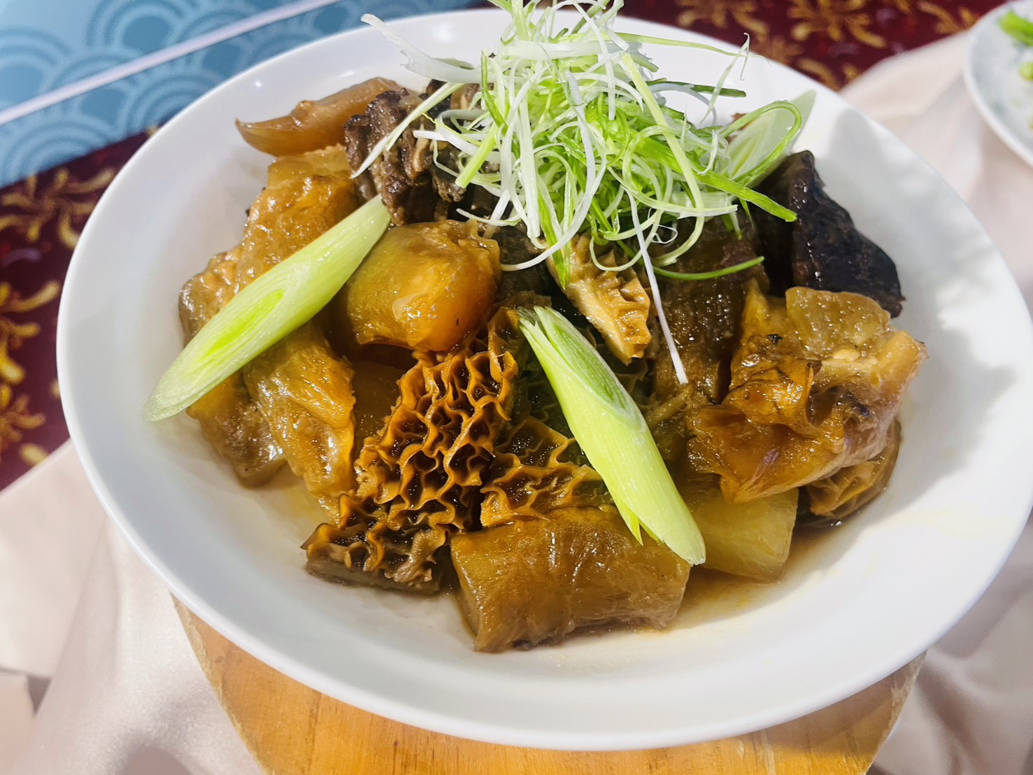 沁園春由無錫蔣家創建於1949年,菜系以江浙為本,融合上海濃油赤醬手法。此次精選六道經典菜色,包括晶瑩剔透、膠質豐富的〈水晶肴肉〉,魚刺酥化、香甜入味的〈蔥㸆鯽魚〉,肥而不膩、醬香濃郁的〈外婆紅燒肉〉,色澤油亮、肉質彈嫩的〈紅燒獅子頭〉,搭配特別為本次合作研發、香酥Q彈的〈秘醬燒烏參〉,以及膠質濃厚、湯色乳白的〈花膠芽白燉雞湯〉,完整呈現沁園春的經典工藝。長園中餐廳則以顧客票選高分菜色回應交流主題,包括酸香開胃、肉質細嫩的〈檸檬雪花牛〉,考驗廚藝精度的〈糯米鑲鳳翅〉,外酥內潤、層次分明的〈荔茸香酥鴨〉,微辣下酒的〈辣味乳香雞〉,暖胃養生的〈胡椒豬肚雞〉,以及集牛腩、牛筋與牛肚於一碗的〈牛三寶〉,展現長園在台粵料理上的創新與深厚底蘊。