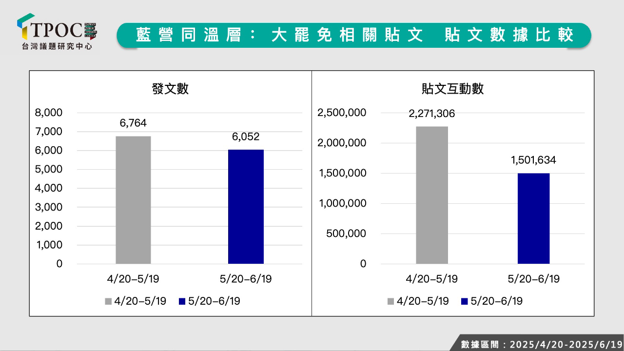 若進一步分析藍營同溫層內部,於4月20日至5月19日之間,以及5月20日至6月19日之間,對於罷免話題的相關貼文,2個月前藍營同溫層內部的貼文互動數高達227.1萬餘則,但過去1個多月以來,相關討論聲量驟降至150.1萬餘則,儘管發文數僅有約7百多則差距,吸引關注數據卻銳減,顯示隨著罷免投票時間逼近,藍營同溫層內部反而有聲量消退、降溫的跡象。然而,國民黨已在「戰鬥藍」號召下,以「熱戰」投入這場反罷免運動,對於試圖凝聚藍營支持者的「反惡罷」一方來說,這或許是個不得不謹慎因應的警訊。