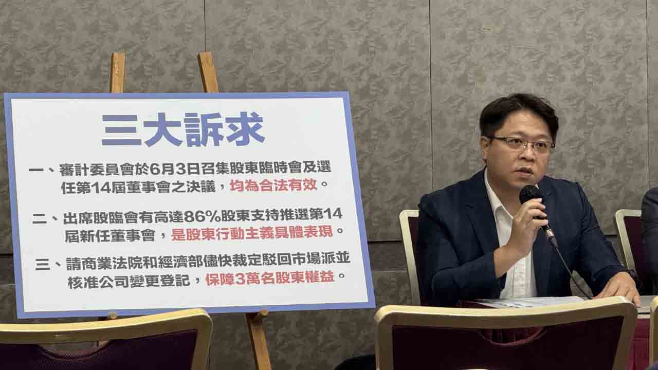 何謹言指出,6月3日股東臨時會,完成改選第14屆全體董事會,公司派提名的候選人新城市投資公司、宇思投資公司、曾芷陵、崔家興、王坤偉,獲86.58%表決支持,新選任董事推舉新城市投資公司代表人陳品文為董事長。