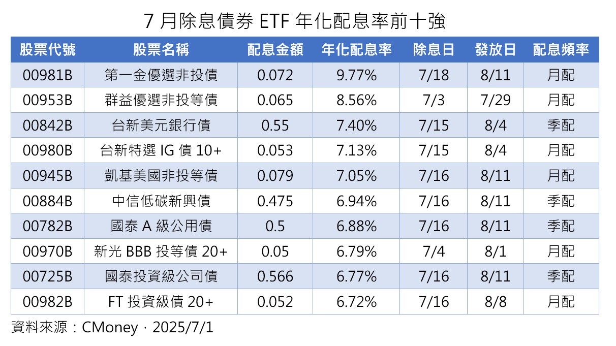 領息族請留意,7月已公告除息的債券ETF,一共49檔,統計至7月1日收盤價,年化配息率前10強,至少6.7%起跳;前2名甚至超過8.5%,包括第一金優選非投債(00981B)的9.77%、群益優選非投等債(00953B) 的8.56%。