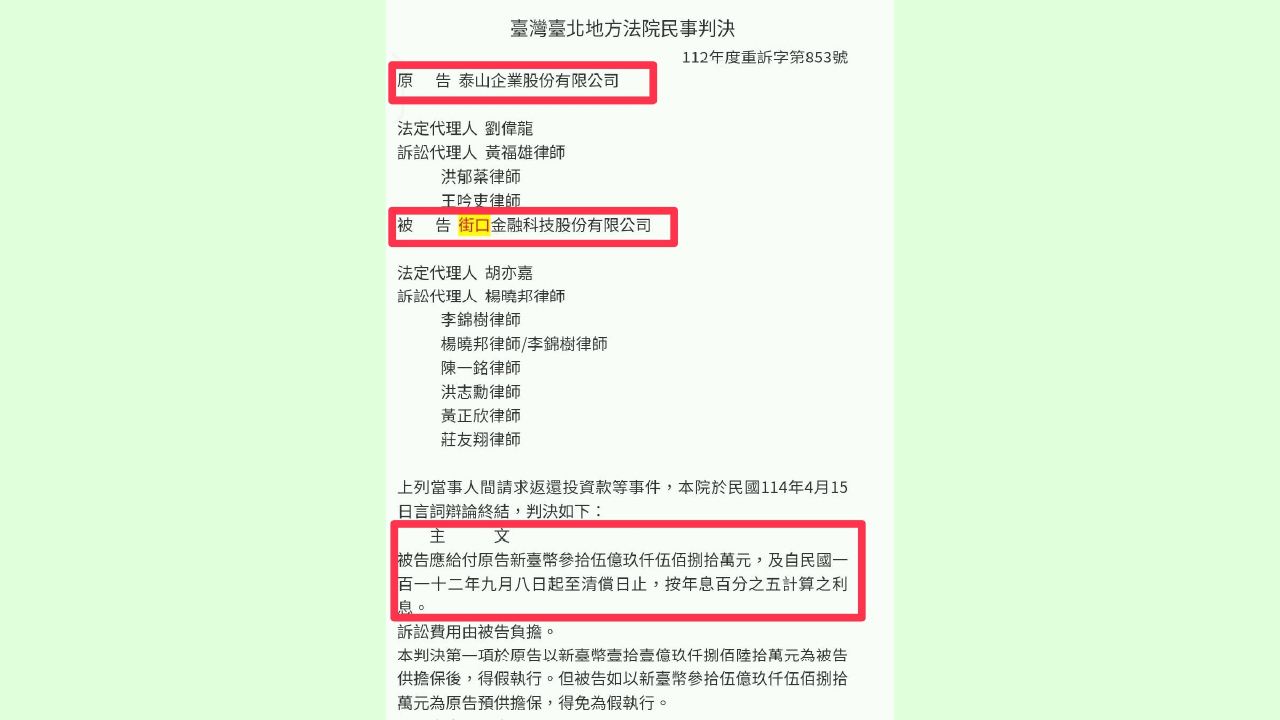 ↑圖說:泰山前董座詹景超主導以36億元買下街口支付4成股權,法院判決交易無效,未料相關帳戶近乎歸零,成為「海角36億」!(圖片來源:翻攝自司法院)
