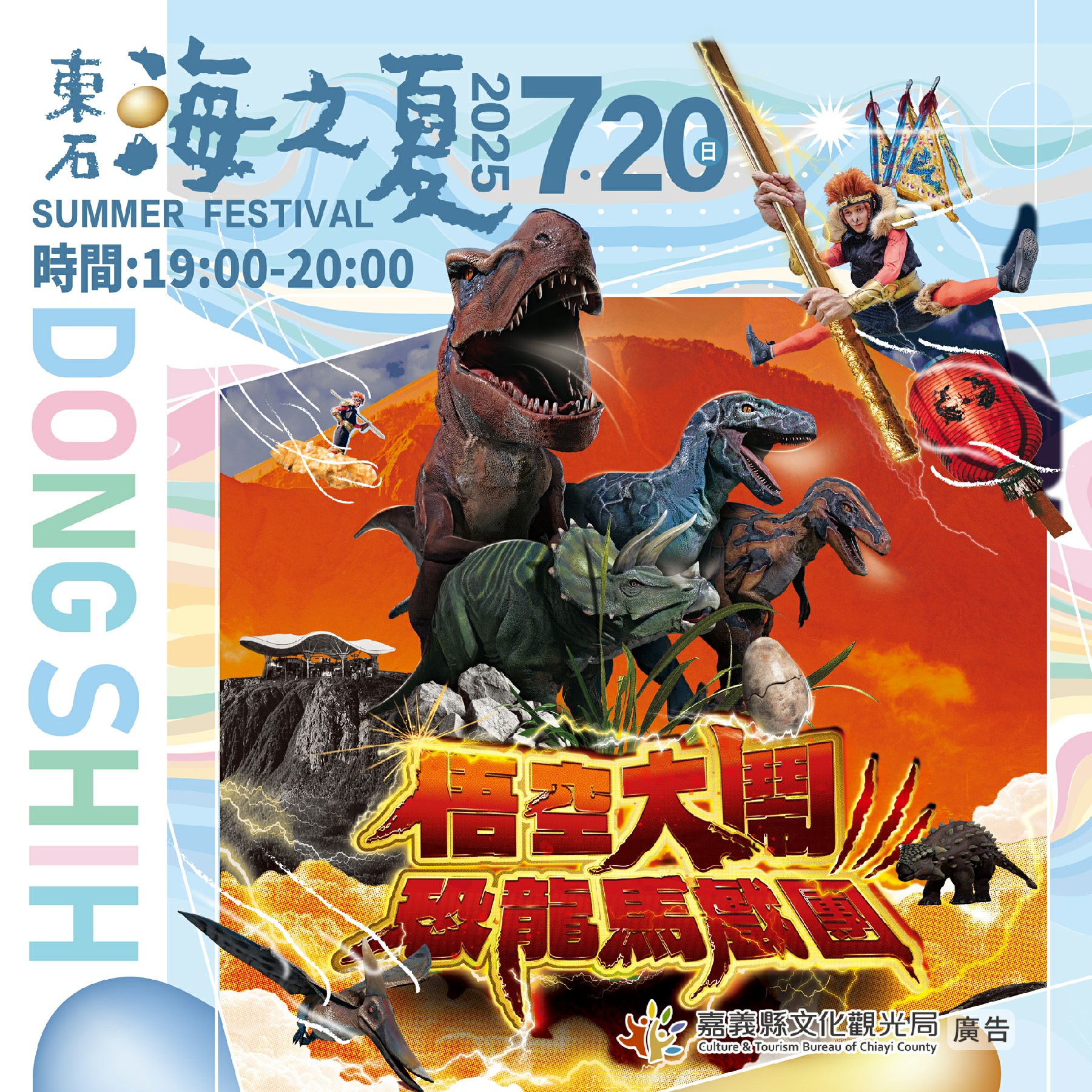 7月20日則為親子場次,由「藝響台灣文化劇團」帶來劇碼《悟空大鬧恐龍馬戲團》,以特技與互動打造南部首演60分鐘長劇,演出場面壯觀,包括五隻高達3米的擬真恐龍及壓軸8米高的暴龍,打造視覺震撼效果,讓大小朋友穿越時空,沉浸在侏羅紀的冒險世界。