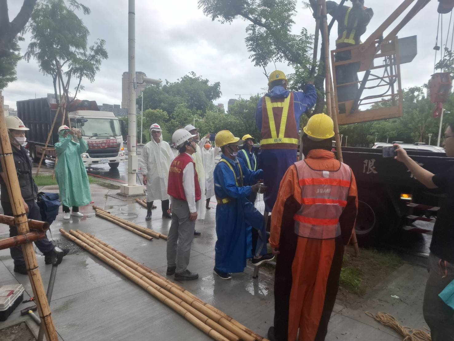 圖說:丹娜絲颱風來襲,市府進行樹木加固支撐,以減少樹木倒伏進而影響公共安全。(圖片來源:高雄市政府提供)