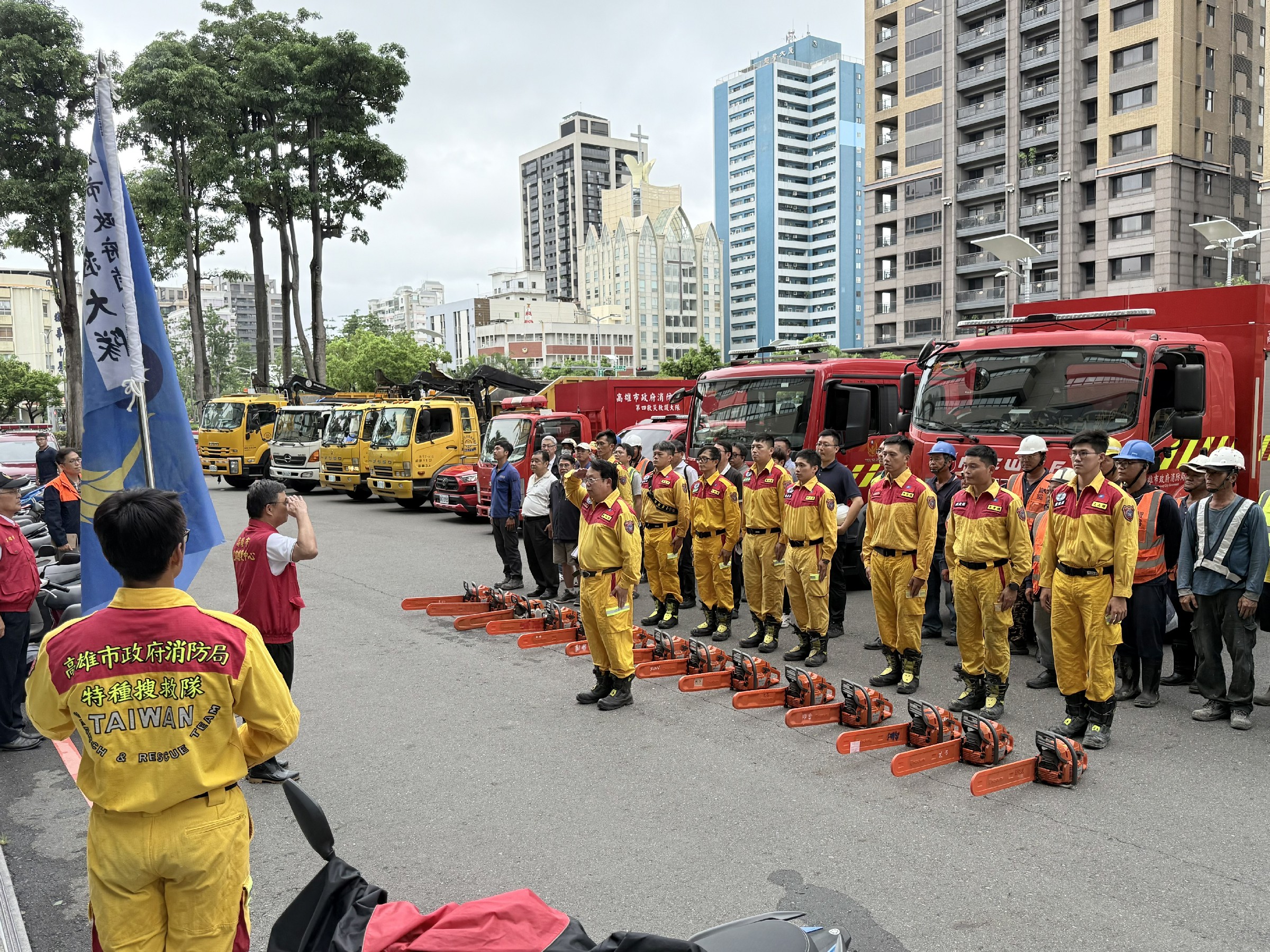 ↑圖說: 高市府展現南部縣市互助精神,市長陳其邁指示整備可動用之機具、車輛與工班人力支援嘉義縣市,在副祕書長王啓川的授旗下,支援嘉義救災。(圖片來源:高雄市政府)