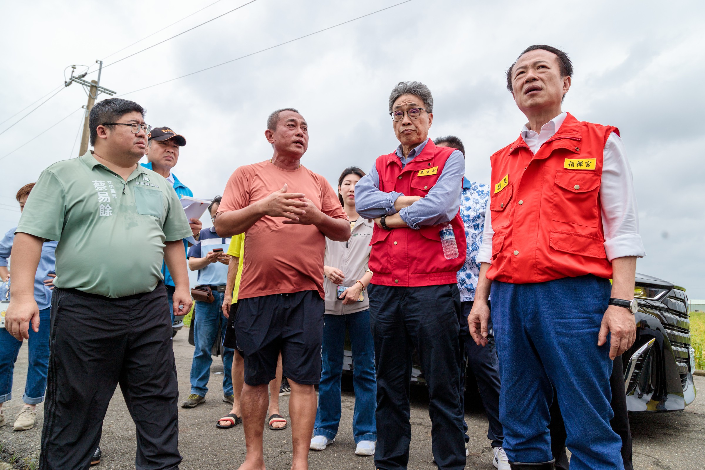 ↑圖說:受丹娜絲颱風影響,嘉義縣農漁業嚴重災損,農業部長陳駿季今會同縣長翁章梁勘查災情。(圖片來源:嘉義縣政府提供)