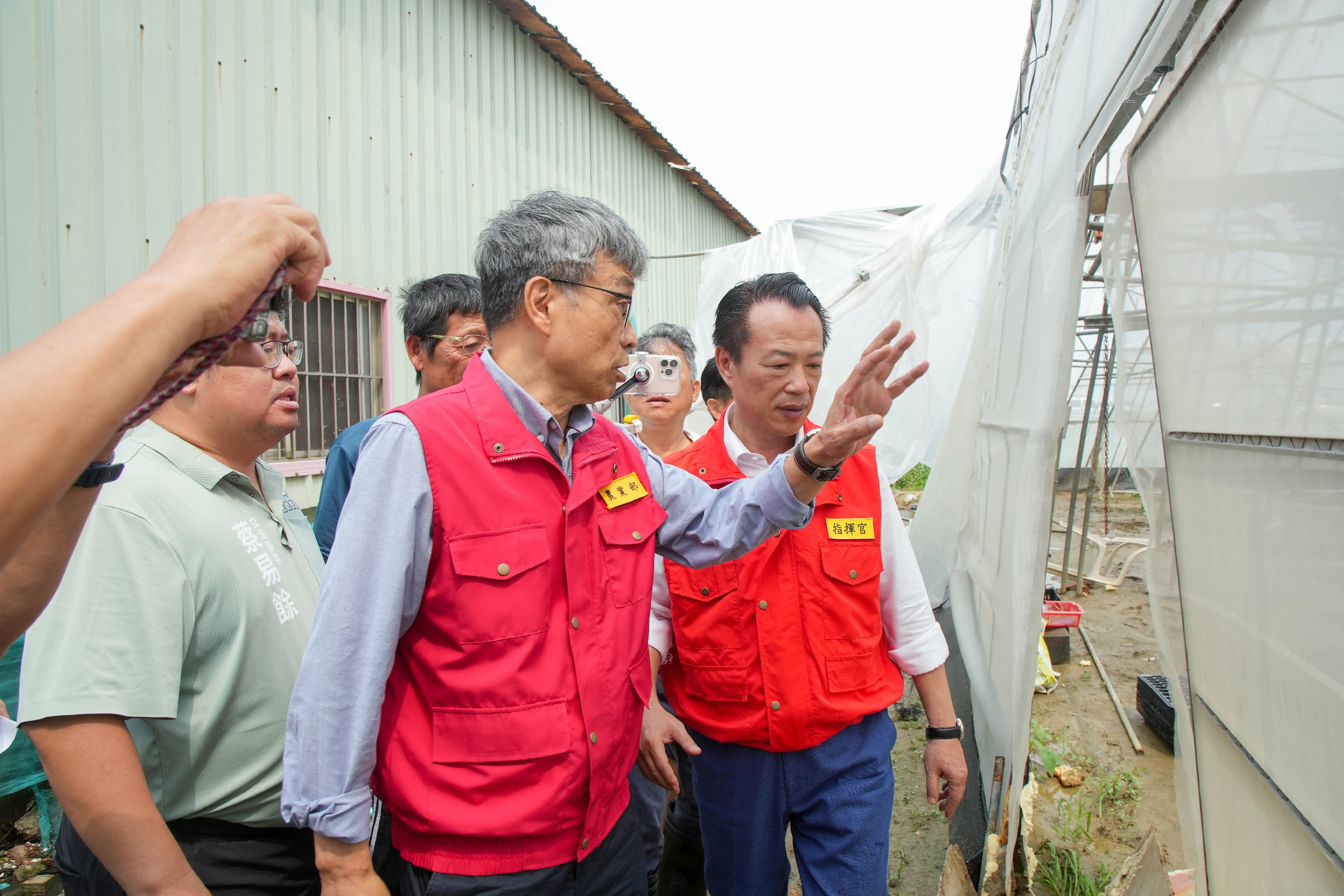 ↑圖說:農業部長陳駿季勘查溫網室損害情形。(圖片來源:嘉義縣政府提供)