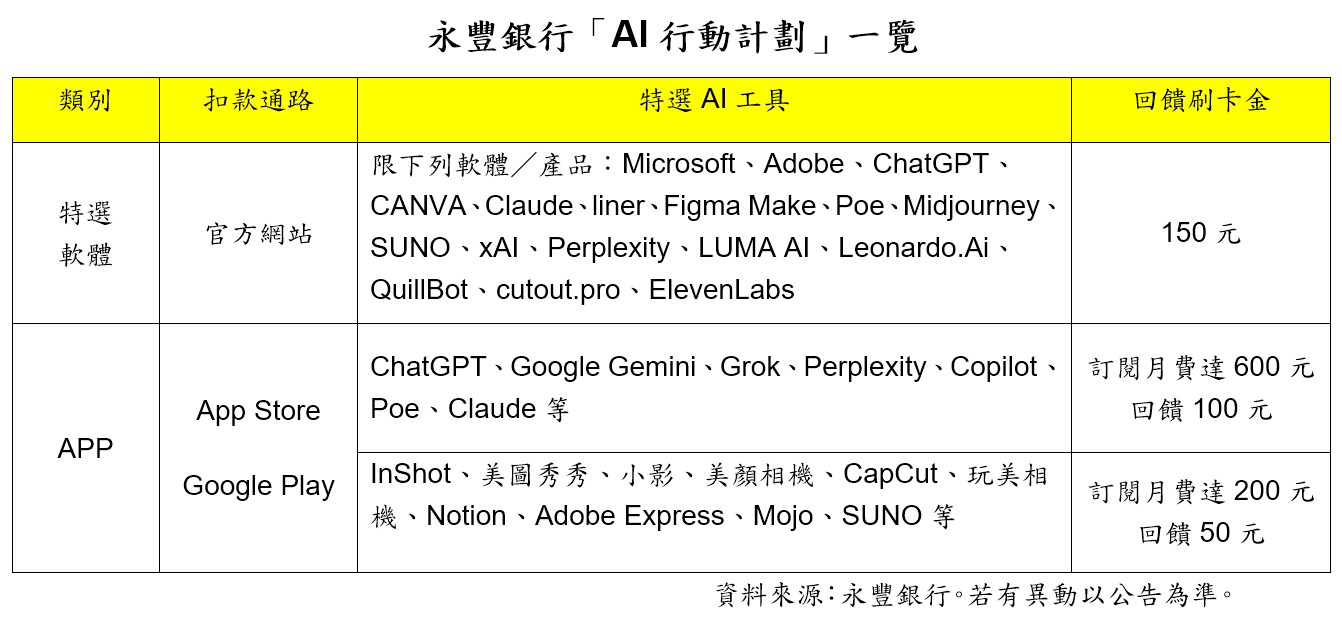 永豐銀表示,這項活動適用Microsoft、Adobe、ChatGPT、Canva、Claude、Google Gemini、Copilot、InShot及美圖秀秀等30種以上AI工具,提供卡友多元應用選擇。