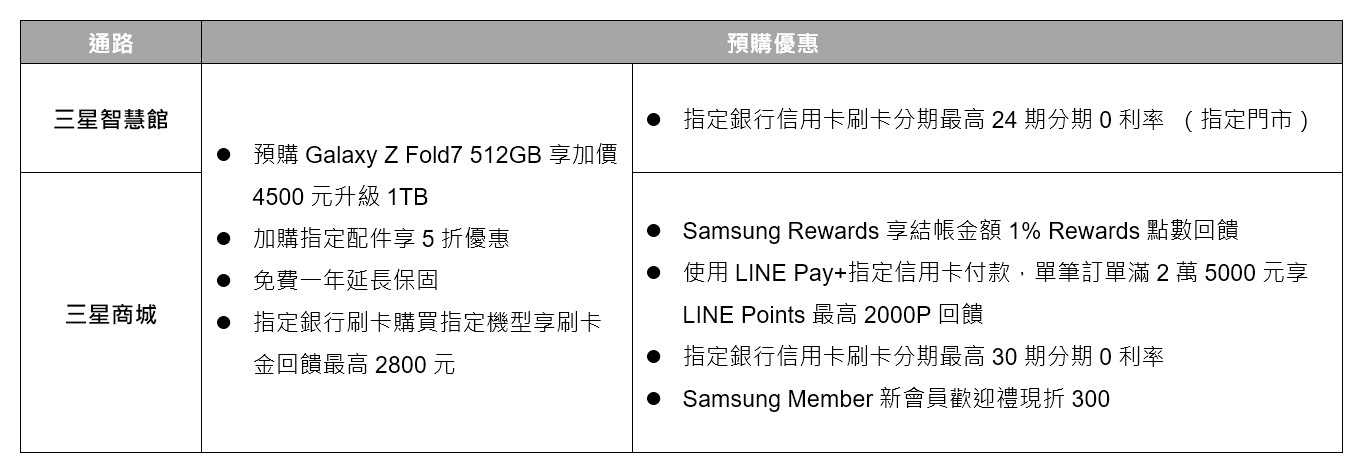 ●於全台指定通路預購Galaxy Z Fold7︱Z Flip7旗艦摺疊256GB版本,享容量升級至512GB版本。