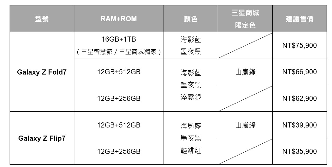 至於Galaxy Z Flip7,推出墨夜黑、海影藍、輕緋紅等3種顏色;有兩種容量版本,其中,12GB+256GB建議售價3萬5900元;12GB+512GB建議售價3萬9900元。