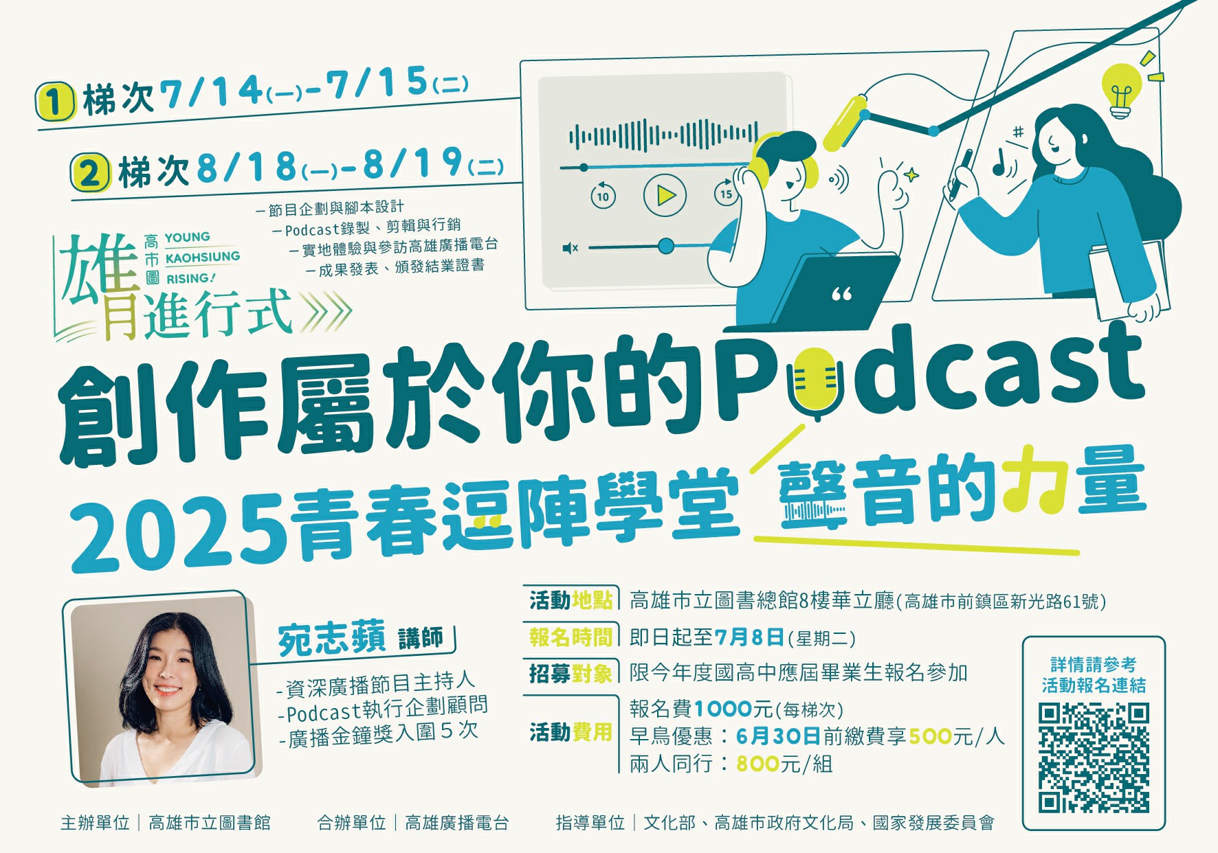 高市圖主打的「雄青進行式」系列活動熱鬧登場,針對青少年族群推出「青春逗陣學堂」與「高雄青年文學獎」等專案。7月14日起開課的「青春逗陣學堂」以Podcast創作為主題,引導學子探索聲音敘事的魅力,報名至7月8日止。而備受期待的城市講堂,則於7月12日邀請旗津國中老師「路邊食薏仁」分享其融合台語與國文教學的獨特課程,帶來文化與音樂交織的講座體驗。壓軸登場的是8月23日的作家侯文詠新書分享會《變成自己想望的大人》,鼓勵青少年探索自我成長之路。